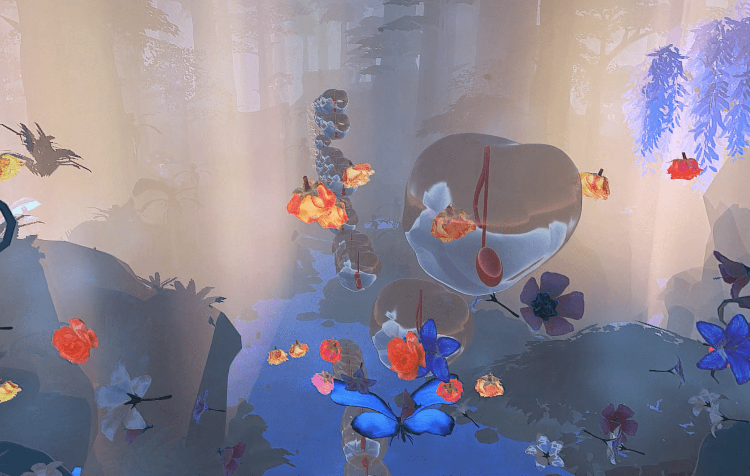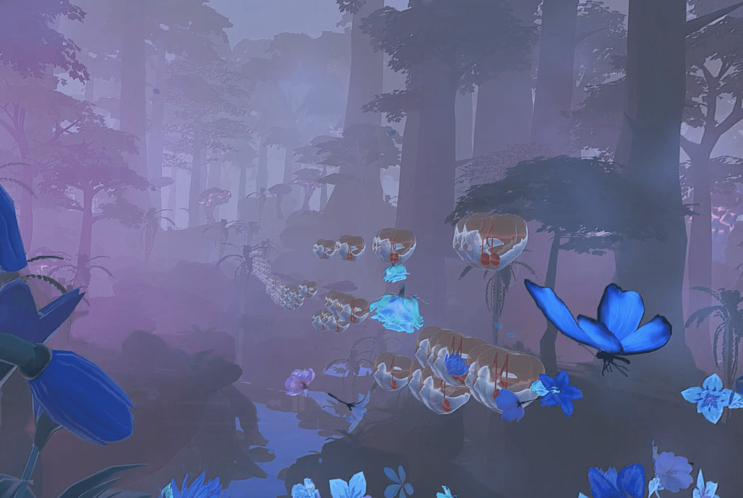 Affective features modulate multiple visual elements within the forest scene. Vocal valence influences the color of flower bloom effects that appear when the butterfly passes through note orbs, using warm and cool tones to convey affective polarity. Vocal arousal controls the density of magical vegetation emerging along the butterfly’s flight path, linking expressive intensity to visible growth activity within the environment.